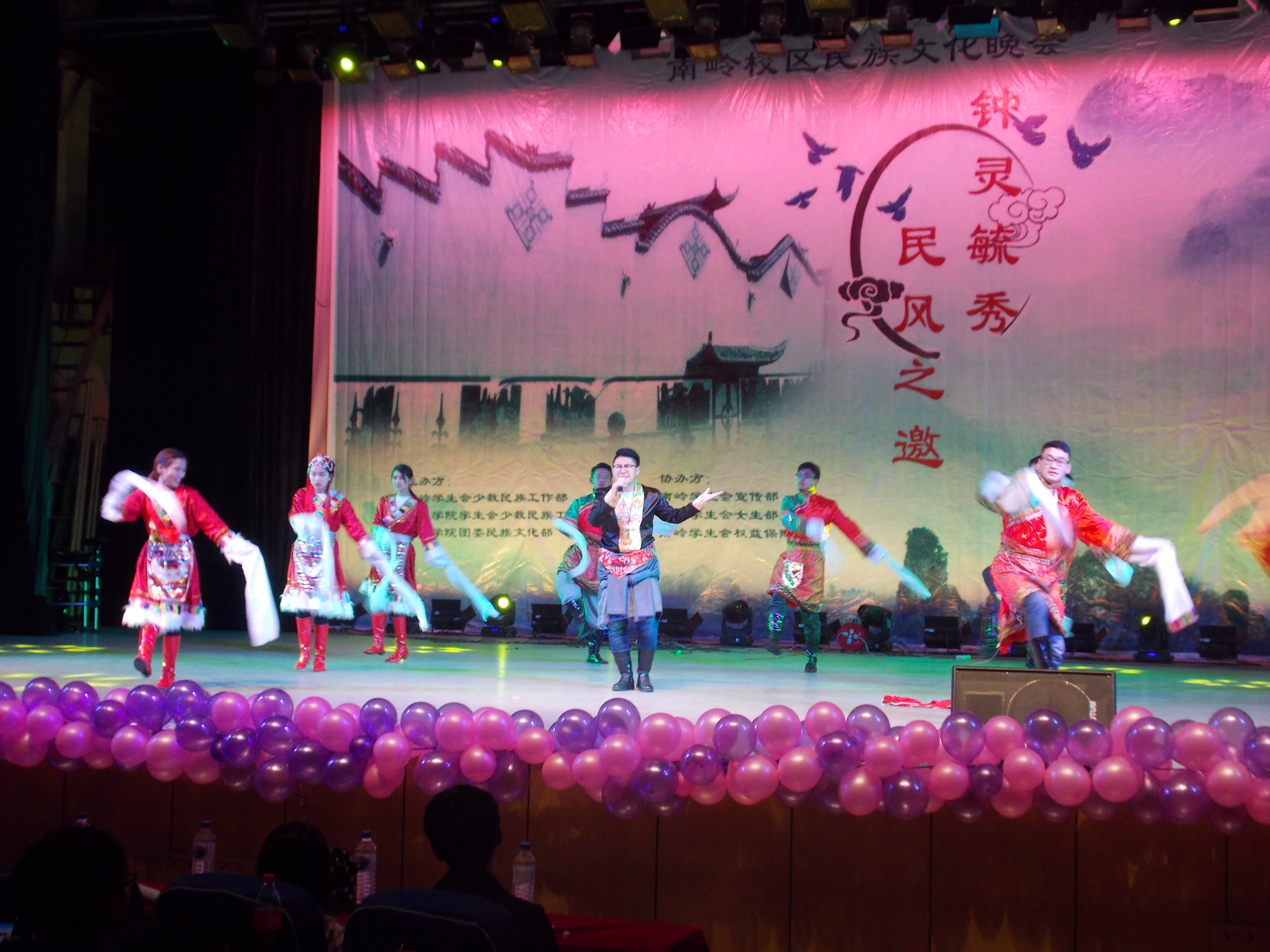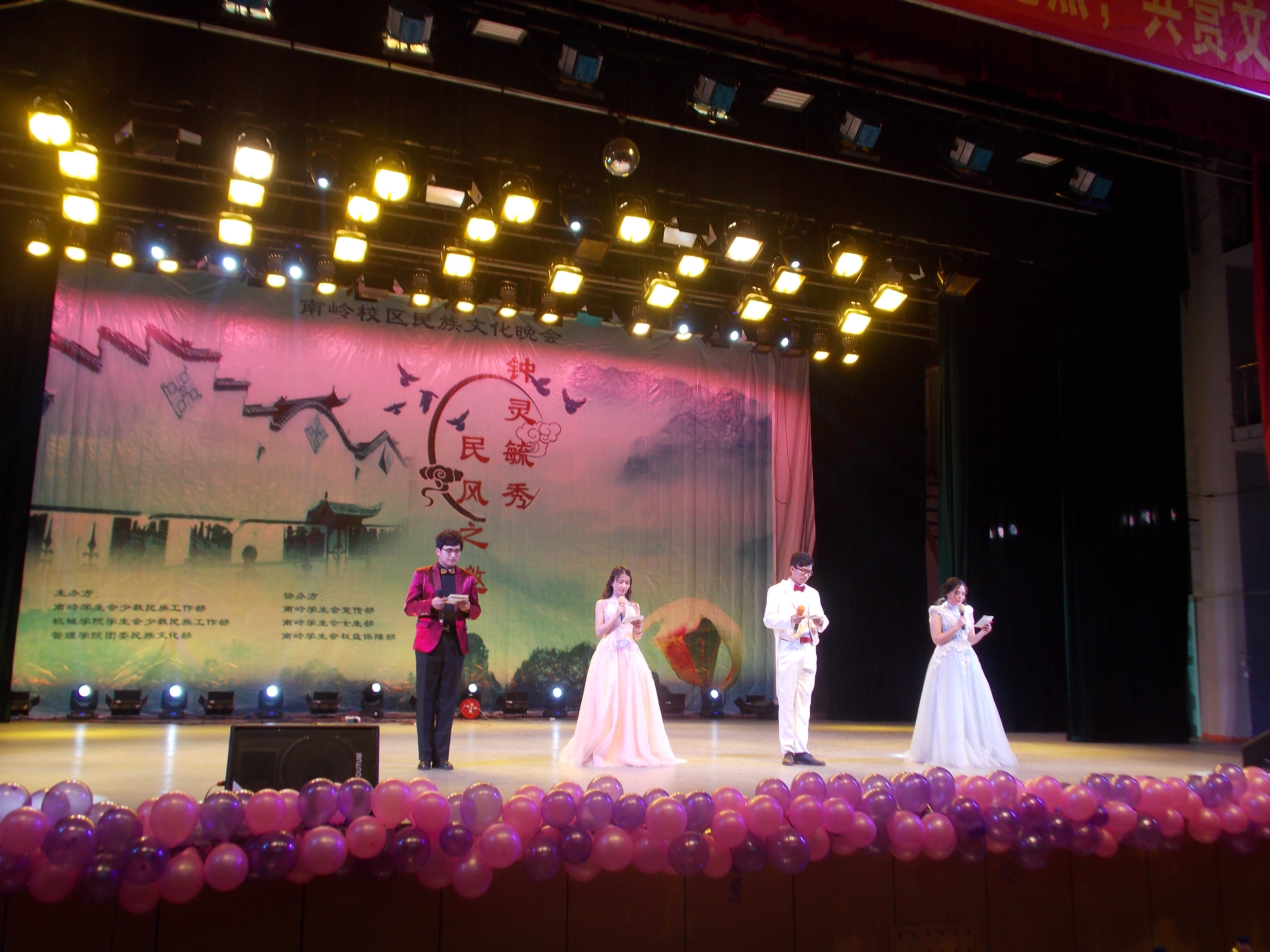 晚会开始,来自南岭的未艾乐队为观众带来了一首带感的《春风十里》,美妙的歌声交织着激昂的乐曲在空中激荡,点燃了观众的热情。随后,主持人做开场白,宣扬了民族团结一家亲的理念,台下掌声四起。本场晚会由“边疆风韵展风采”、“万紫千红颂中华”、“山歌水舞情满堂”三部分组成,中间还设有激动人心的抽奖环节。来自全国各地的各民族同学们在舞台上尽情展示才艺,观众们欣赏到了洋溢着青春气息的藏族舞蹈《青春踢踏》、充满西域风情的歌曲《维吾尔人》、反映伟大爱情的朝鲜族歌舞《阿里郎》、热情奔放的土家族舞蹈《女儿嫁》还有经典粤语歌曲大串烧等众多精彩表演。晚会最后,所有工作人员到台上表演大合唱《一家人》,为此次晚会画上了圆满的句号。