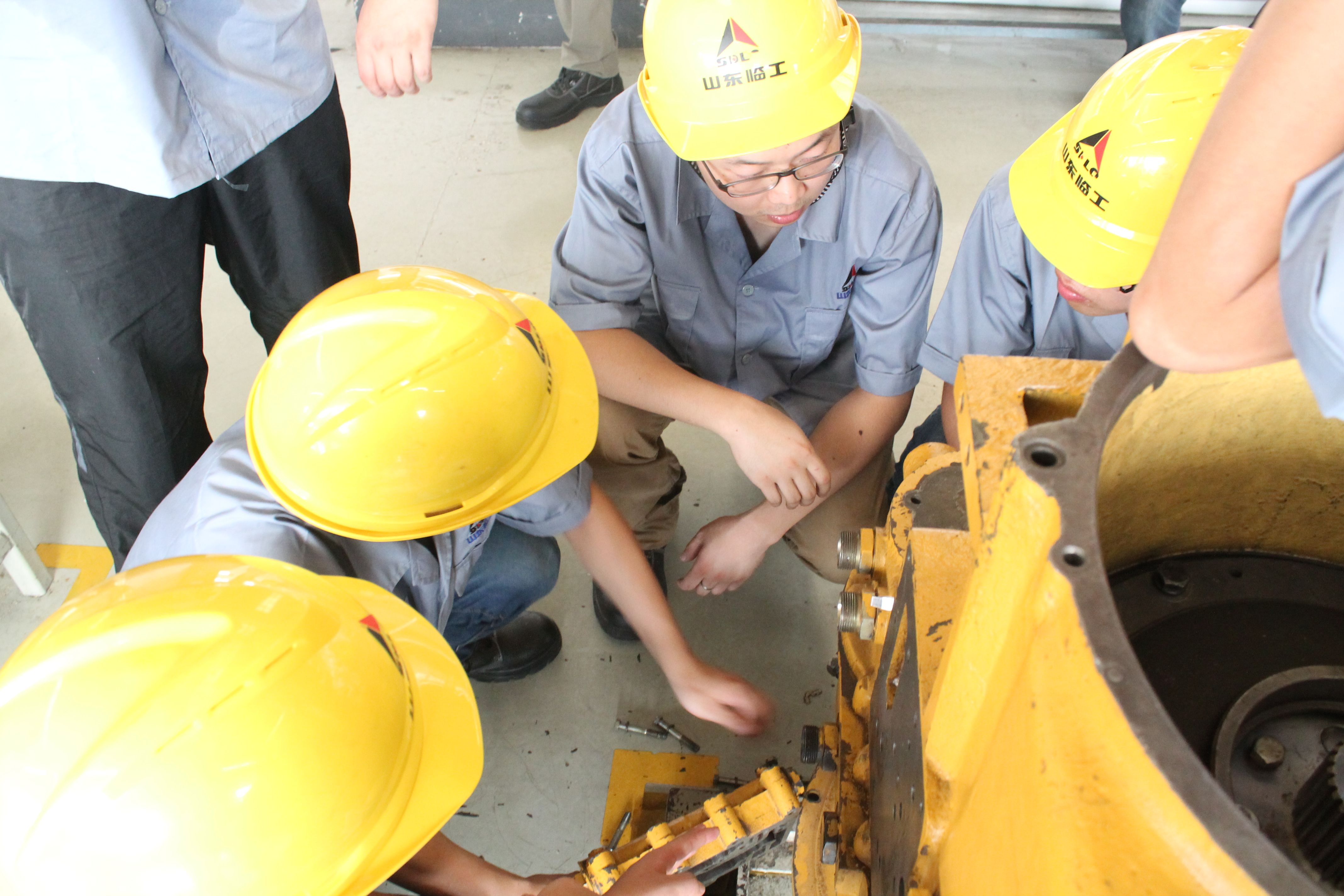 7月17日上午,来自临工的工程师为大家讲解了装载机的传动和结构原理,为17日下午和18日在临工实习基地拆装做好知识储备。让同学们亲身动手实践,做到理论与实践相结合。 下午,实践团在相关人员的带领下进入了实习基地的拆装车间,5名临工的实习生分别带领5个队进行拆装的讲解及演示。17日下午和18日上午拆装的主要内容是变速箱和变矩箱,复杂的内部结构和炎热的工作环境并没有打消同学们的热情,每一个人都认真的听专业人士的讲解,遇到不懂的地方会参考图纸,真正了解它们的工作原理。同学们对于拆装的认真态度受到工厂师傅们的称赞。18日下午,还没到达车间,异常炎热的天气已经使得同学们汗流浃背,但是同学们没有被炎热的天气所影响。下午的拆装内容是装载机和挖掘机的液压控制阀总成,庞大的零件必须要借助起吊机才能完成拆装,同学们看到内部复杂的结构和高深的液压技术,在感叹祖国工业蓬勃发展的同时也感受到了自身知识的欠缺。