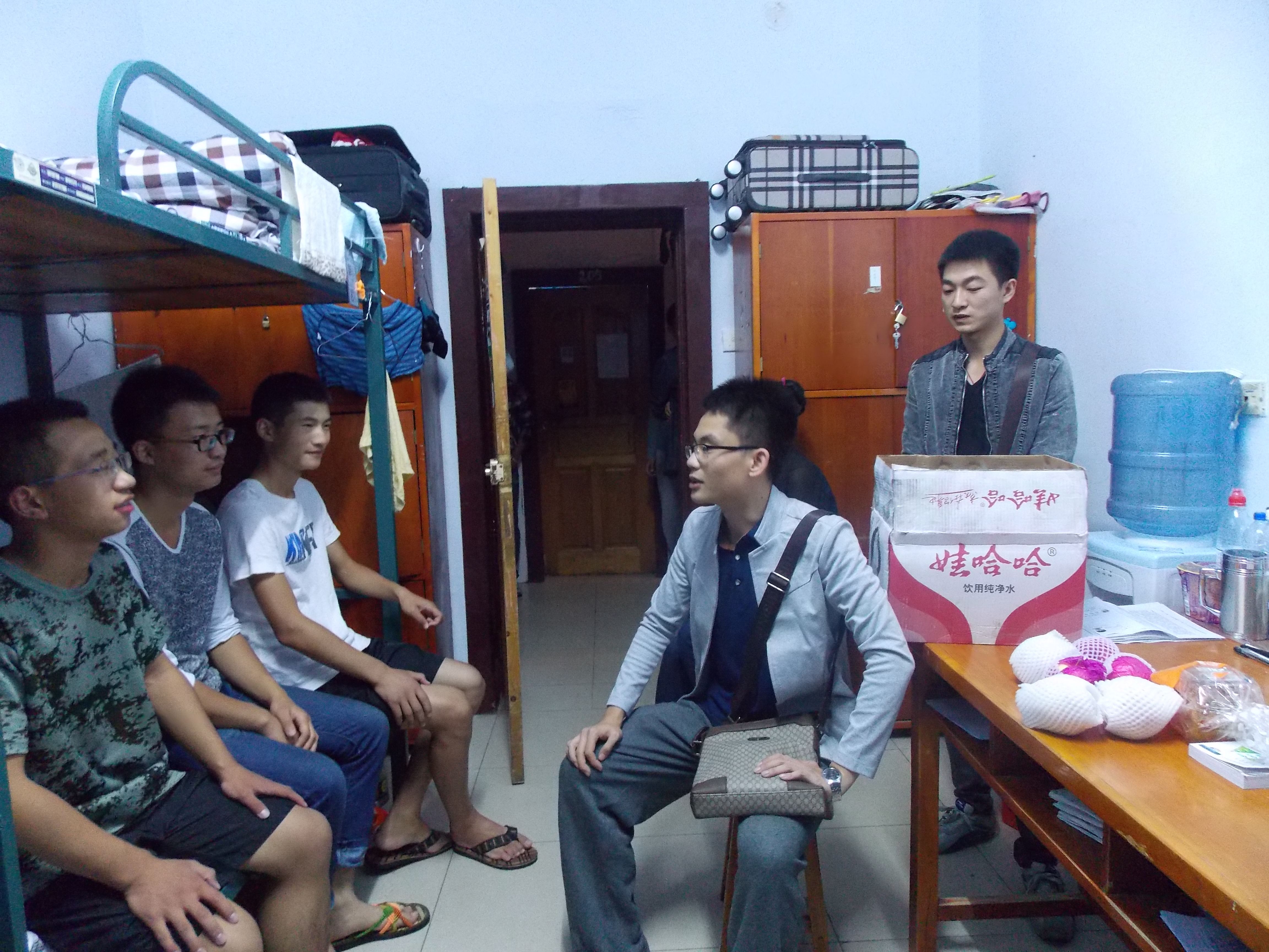 代理班主任分为两组,分别为三公寓的14级男生和十二公寓的14级女生分发月饼及水果。现场氛围温馨,同学们对此十分感动,并连声道谢。两位老师跟随走访,对新生嘘寒问暖,并督促新生们在今后的老员工活中要勤奋踏实、刻苦学习,沿袭bevictor伟德的优良传统。当来到自己曾住过的寝室时,夏禹老师为寝室的新主人介绍自己过去的寝室生活,感慨良多。此外,夏禹老师还对新生的日常生活、军训情况做了调查了解,在亲切交谈中拉近了与员工的距离。