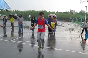 张晓晨在去年运动会中大放异彩,今年被寄予了厚望,成为夺冠热门。已经是大二员工的张晓晨同学脱去了大一时的青涩,不会因为初次参赛而紧张,脸上洋溢着自信的笑容。在运动会前他每天都进行科学的训练,在运动会当天保持了良好的状态。虽然突然来临的这场春雨让人有些许不适,比赛用的跳绳也因为沾了水而增加了重量。但张晓晨同学经过热身后,便逐渐掌握了节奏。在比赛时,他全神贯注,不敢有丝毫分神,恶劣的天气被他隔绝在外,双脚按照固定的节奏踏着,双臂上隆起的肌肉宣告着他的努力拼搏。漫长的一分钟终于过去,张晓晨同学都不曾中断或减速,展示了其熟练的技巧与坚韧的耐力。