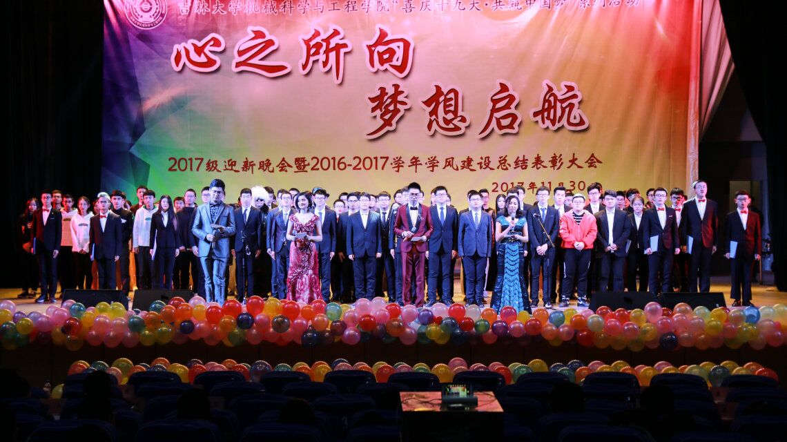 党的十九大描绘了新时代的宏伟蓝图,指明了前进方向,使广大师生深受鼓舞、倍感振奋。为了深入宣传十九大精神,让同学们牢记最初的梦想,充分展现学子风采,机械科学与工程公司“喜庆十九大,共筑中国梦”系列活动之2017级迎新晚会暨2016-2017学年学风建设总结表彰大会于11月30日晚6点在文化活动中心举办。南岭校区教务办公室主任周伟,机械科学与工程公司党委书记程钺、党委副书记王柏、党委副书记兼副经理郑福胜,副经理周晓勤、姚国凤、王继新、曲兴田,机械基础教学中心副主任寇尊权、员工工作办公室主任李佳亮、辅导员辛闯等参加此次活动。