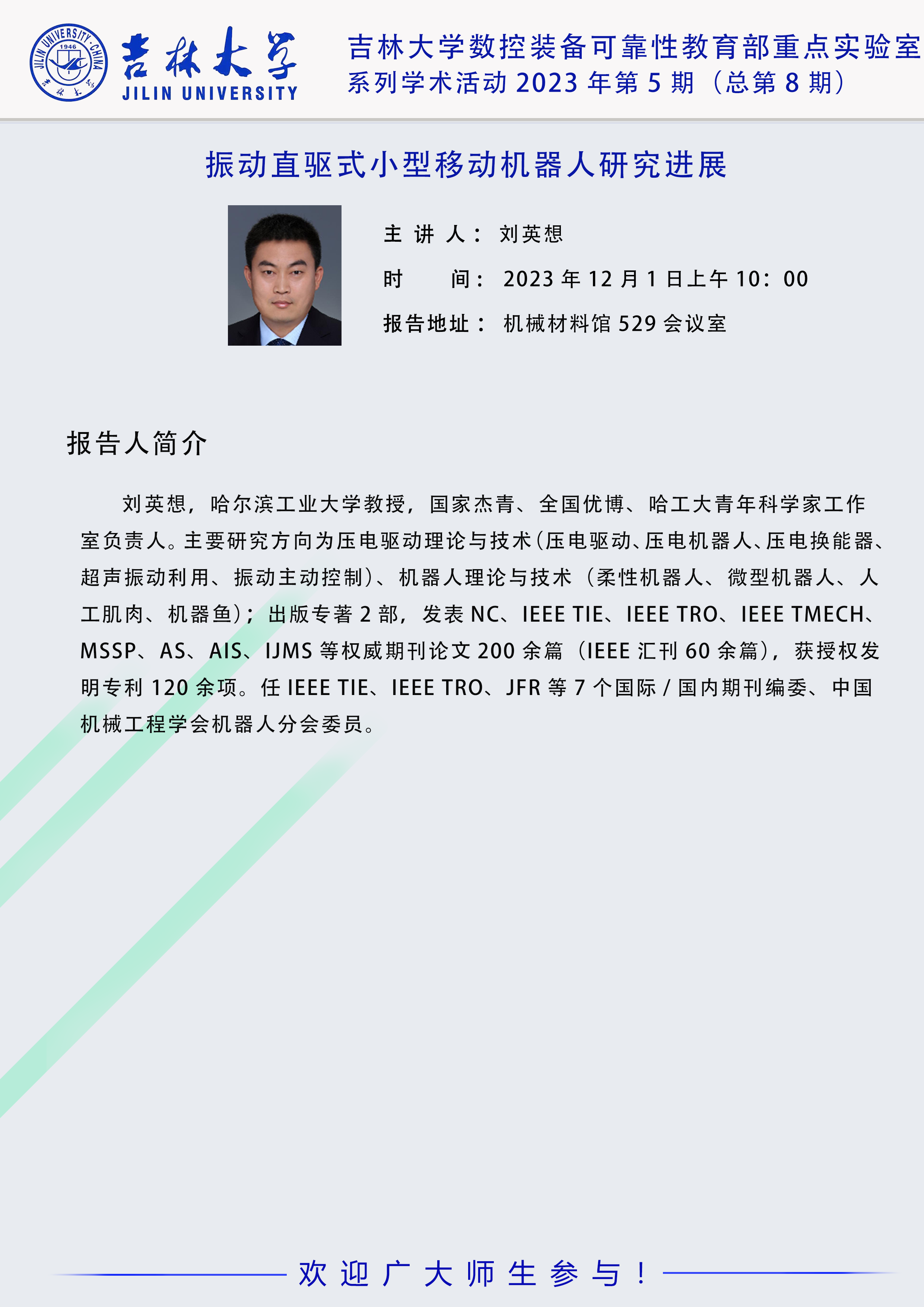 报 告 人:刘英想,教授,哈尔滨工业大学