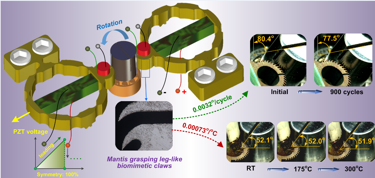 近期,bevictor伟德赵宏伟教授团队在超精密驱动器方面取得新进展。基于仿生粘滑运动原理,研制了一种新型压电-热耦合双向旋转驱动器。该驱动器通过螳螂前足式仿生爪和加热组件可以分别实现由压电粘滑和热膨胀效应产生的顺时针宏观旋转和逆时针回退。在相对较低的频率和较高的电压下,旋转回退被有效抑制。基于三维光学成像对顺时针缓慢粘滞和逆时针瞬时粘滞过程的实时观测,试验揭示了0.2μrad的压电驱动旋转分辨率和0.00073o/oC的热诱导微观分辨率。