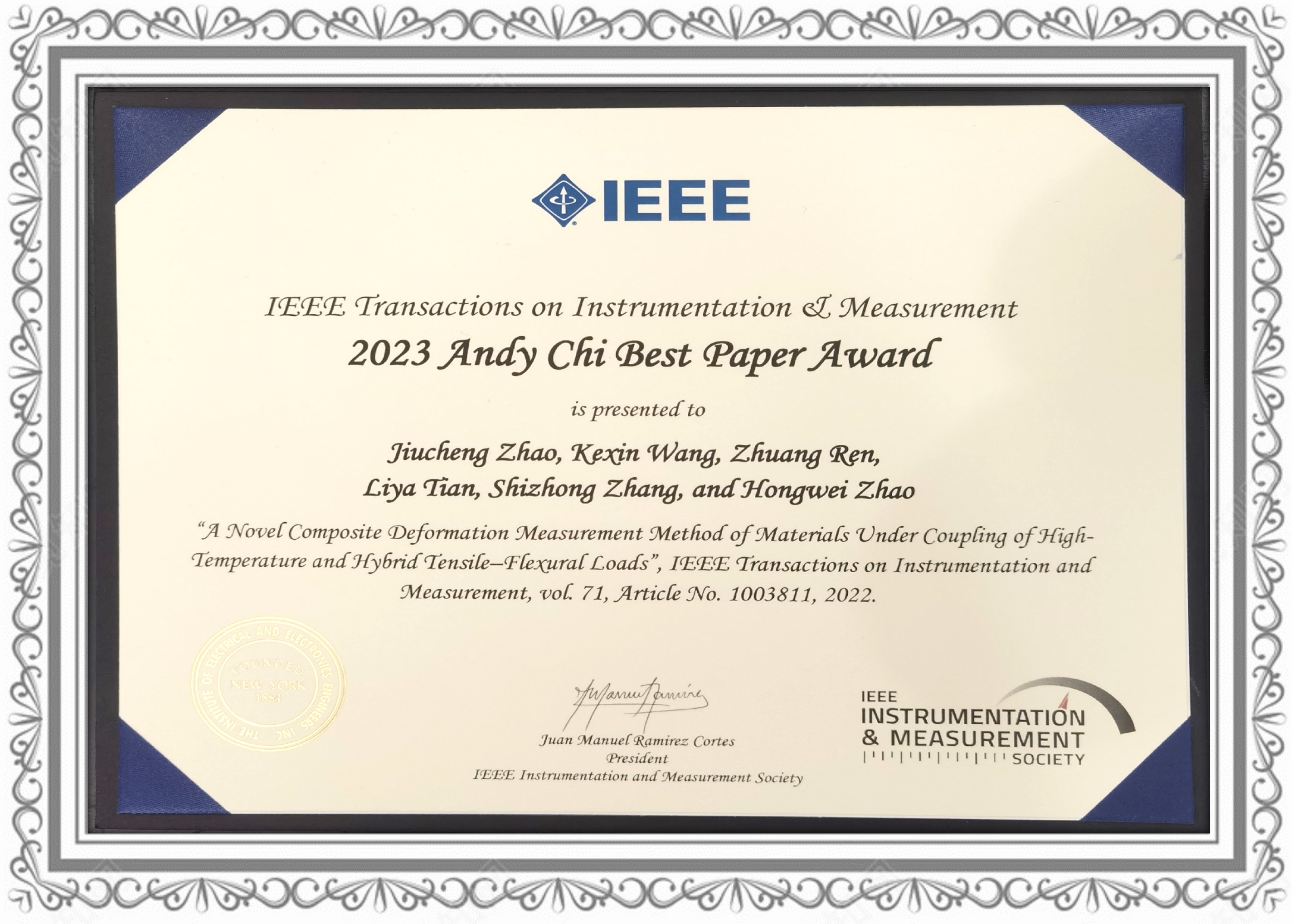 IEEE TIM Andy Chi最佳论文奖,旨在表彰在仪器仪表和测量(TIM)领域具有重要创新性、影响力和应用价值的成果。公司本届获奖论文,经过严格评审程序,从2022年IEEE TIM期刊正式出版的1714篇论文中脱颖而出,成为年度唯一获奖论文。本次获奖,使公司成为继清华大学和哈尔滨工业大学之后国内第6个获该奖项的高校,表明公司在模拟复杂工况材料-构件使役性能测评技术与仪器方面的研究工作充分得到国际认可。