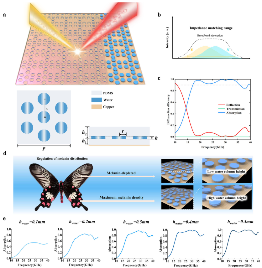 研究团队从红珠凤蝶翅膀的微观结构中汲取灵感,扫描电子显微镜图像显示了前翅和后翅的分级多孔结构。尽管天然孔隙几何呈现空间无序,但研究识别出两个关键的生物功能原理:无序孔隙的集合行为实现全向波散射和极化不敏感吸收;分级孔隙创造多尺度共振,共同扩展有效传播路径。基于此,设计中将微米级孔洞按电磁波长缩放至毫米级,建立适用于微波波段的亚波长共振单元。采用中心对称六边形周向阵列排列作为功能模拟,将自然空间无序转化为人工旋转对称,确保极化无关响应,同时通过受控的多级共振耦合增强带宽。材料上,水作为“人工黑色素”功能体,替代黑色素的电子跳跃损耗,利用其本征德拜弛豫动力学,并通过主动调整水柱高度实现流体动态可调性。上层PDMS层模拟蝴蝶翅膀的表皮保护层,利用低折射率和表皮与空气的介电差异构建宽带阻抗渐近层。