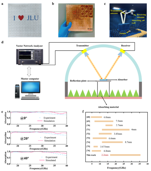 图11: a) 仿生PDMS层;b) 所提出仿生吸收器图片;c) 测量设置;d) 测量设备连接图;e) 所提出宽带吸收器的测量吸收和仿真吸收;f) 所提出吸收器与最先进超表面微波吸收器的比较。
