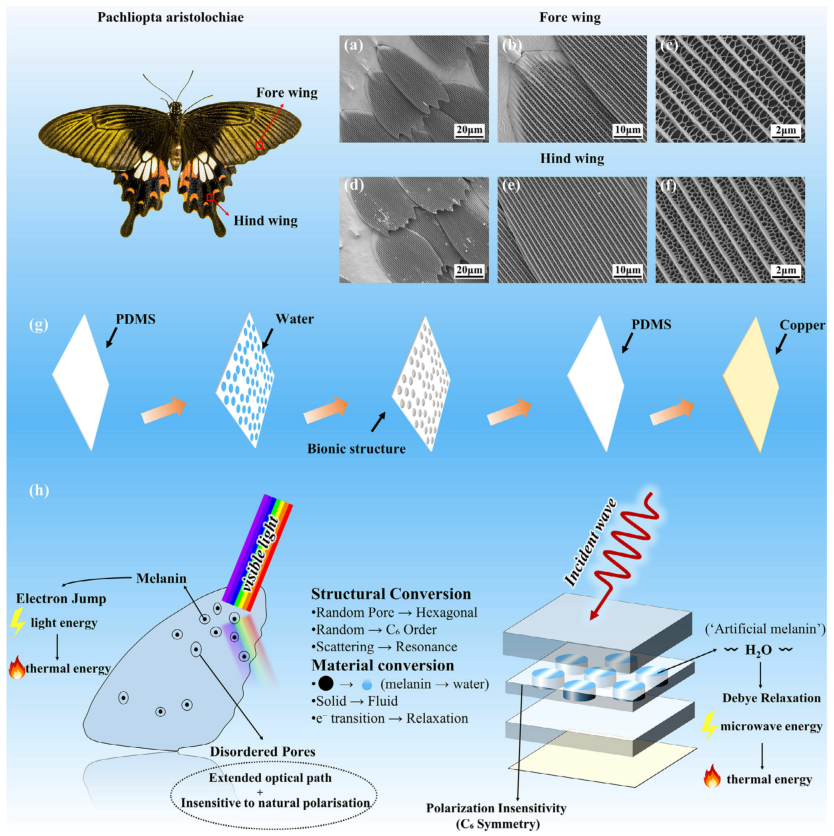 图1: 红珠凤蝶照片及其翅膀表面微观结构的SEM图像,前翅a-c和后翅d-f;g) 仿生超材料吸收器制备过程;h) 仿生机制示意图:左为生物原型,可见光与无序孔隙和黑色素相互作用;中为仿生转换,结构转换(无序→六边形有序)和材料转换(黑色素→水);右为工程吸收器,通过C6对称单元中的共振耦合和德拜弛豫实现微波吸收。