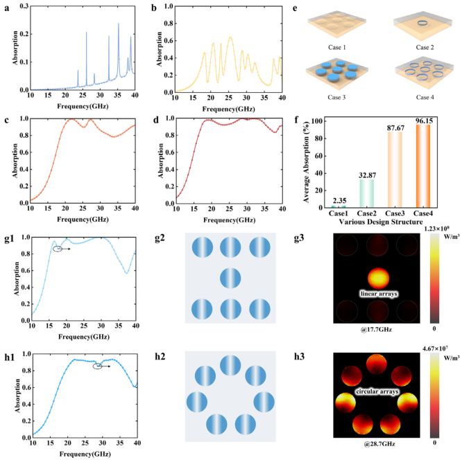 图8: a-d) 四种配置的吸收光谱和e) 示意图;f) 平均吸收率;g1-g3) 线性阵列:g1) 吸收光谱,g2) 示意图,g3) 17.7 GHz功率损失密度;h1-h3) 圆形阵列:h1) 吸收光谱,h2) 示意图,h3) 28.7 GHz功率损失密度。