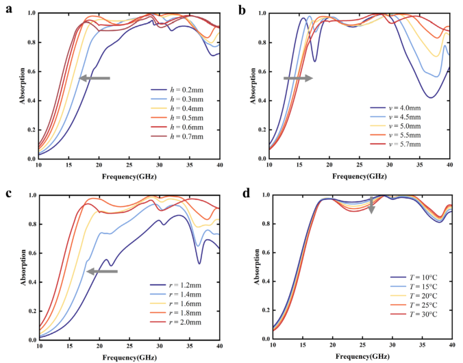 图9: 不同参数下水基吸收器的吸收光谱:a) 水单元高度h;b) 中心水单元到周边水单元半径的距离v;c) 水单元半径r;d) 水温度T。