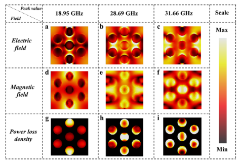 图7: 所提出吸收器在18.95、28.69和31.66 GHz模拟TE极化条件下的波:a-c) 电场;d-f) 磁场;g-i) 功率损失密度。