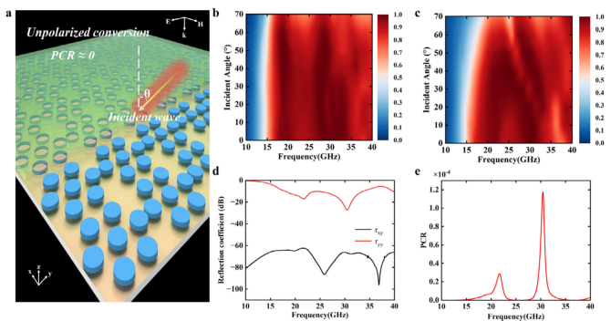 图10: a) 入射波以一定角度入射所提出超吸收器表面的示意图;b) TE模式下不同入射角的水基吸收器吸收;c) TM模式下不同入射角的吸收;d) 仿真同极化和交叉极化反射系数;e) 正入射波下仿真PCR随频率变化。