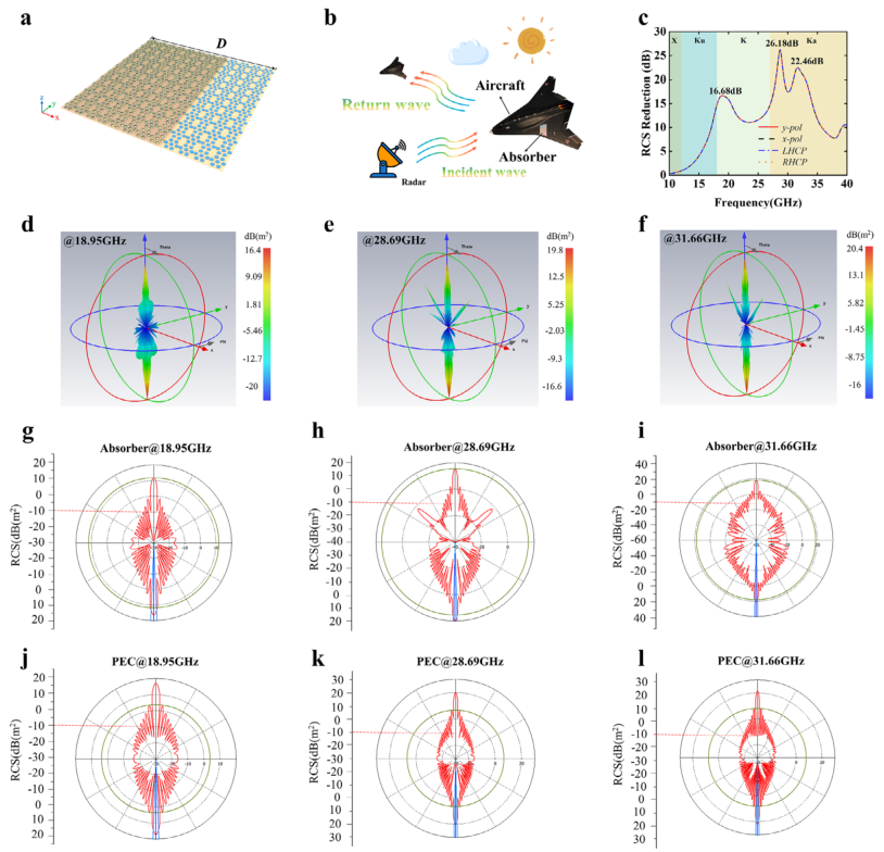 图4: a) 设计的12×12单元吸收器;b) 所提出RCS减少超表面示意图;c) 所提出吸收器在不同极化状态下的RCS减少;d-f) 所提出吸收器在18.95、28.69和31.66 GHz的3D散射模式;g-i) 所提出吸收器在TE极化下18.95、28.69和31.66 GHz的顶视图RCS模式;j-l) 完美电导体(PEC)板在TE极化下相应频率的顶视图RCS模式。