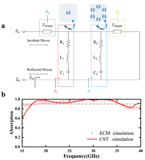 图5: a) 所提出仿生吸收器的等效电路模型;b) 所设计吸收器在正入射下的有限元法仿真和ECM计算吸收光谱。