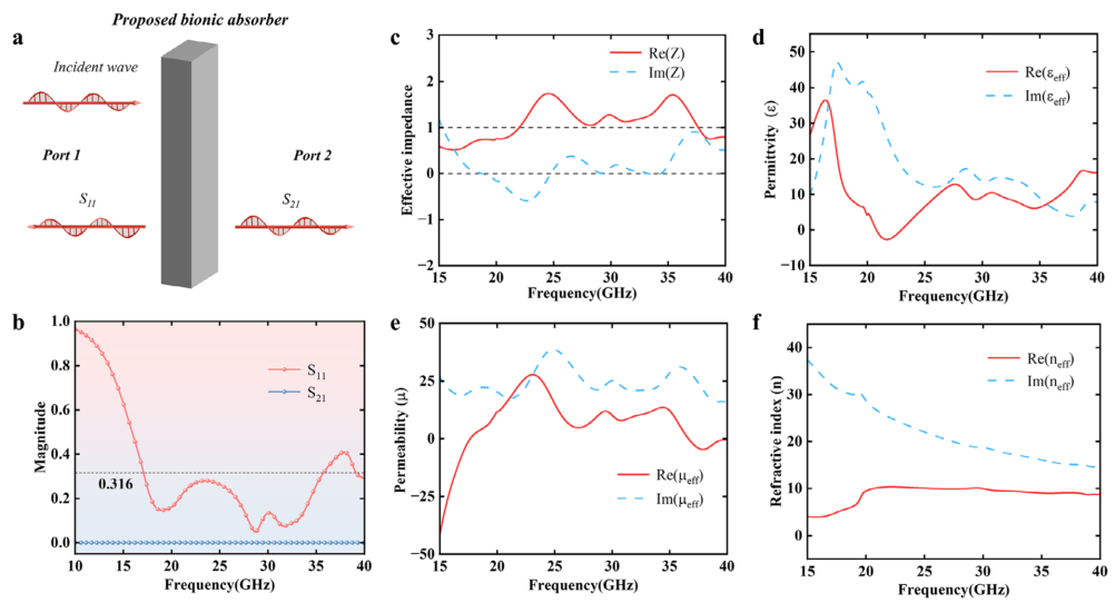 图6: a) 所提出超材料吸收器的S参数示意图;b) 正入射下仿真S11和S21振幅;所提出仿生吸收器的有效参数:c) 有效阻抗;d) 有效介电常数;e) 有效磁导率;f) 有效折射率。