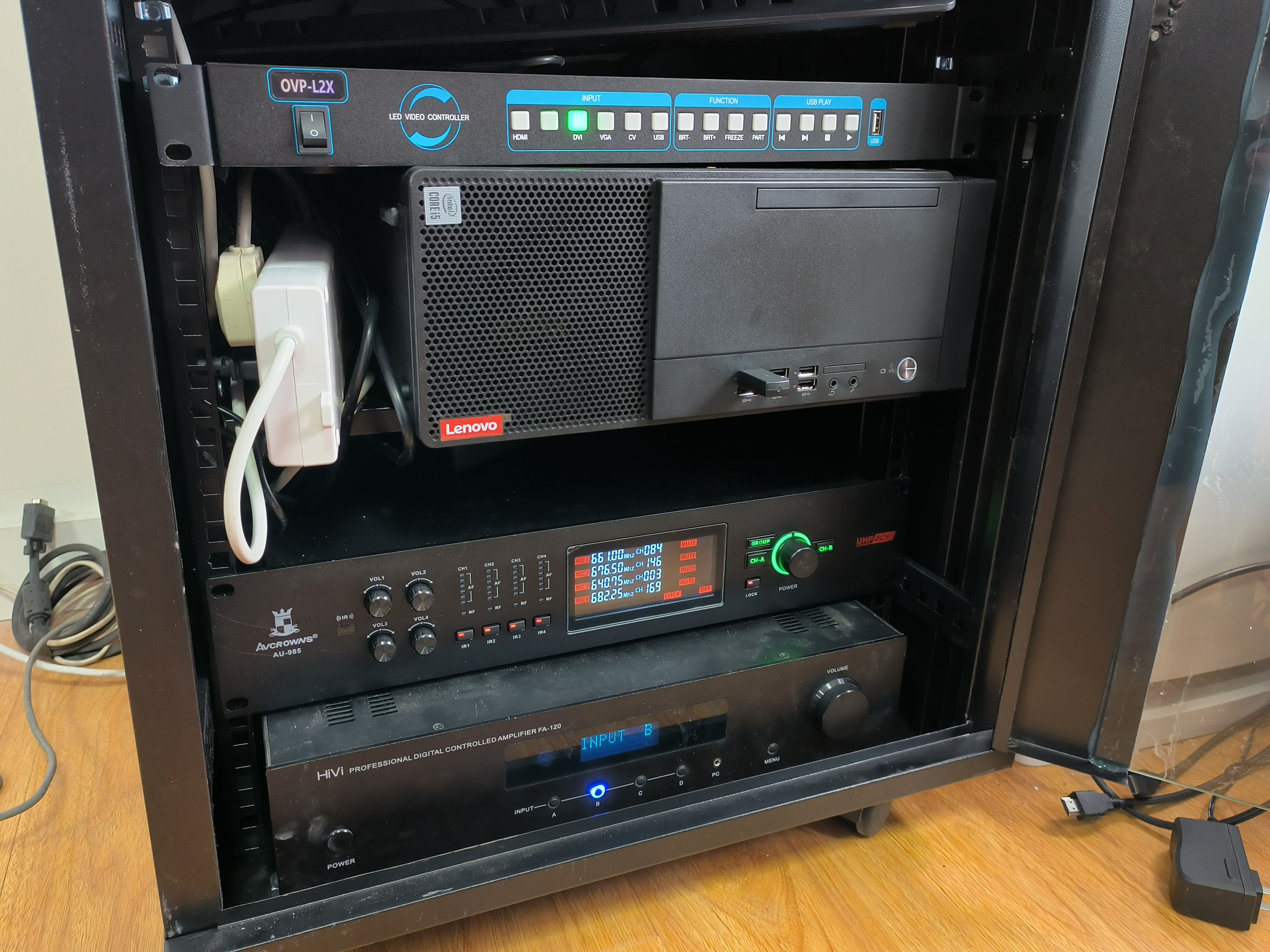 机柜和电脑主机均在讲桌旁机柜里。无线键盘、鼠标,已经通过前置USB接收器连接。