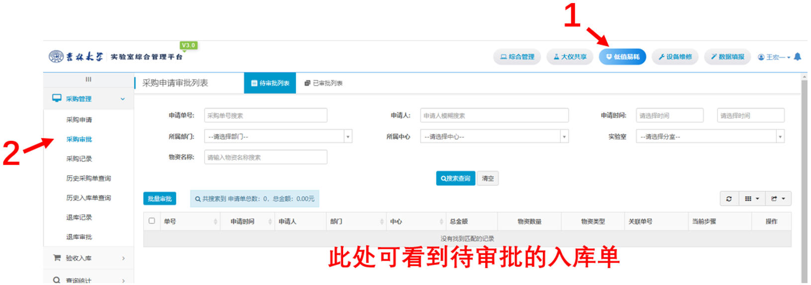 验收人审批入库单时可参考此步骤,如下图依次点击。(1.低值易耗2 .采购审批)
