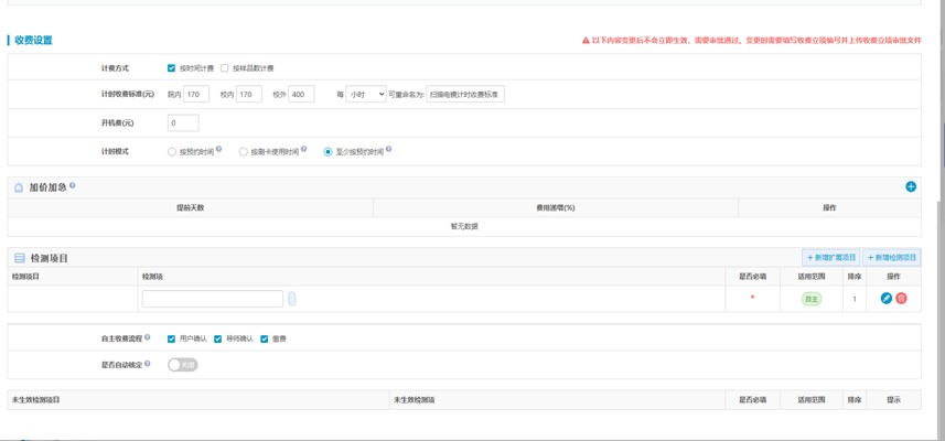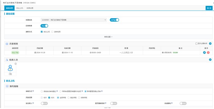 5.这个页面进行仪器开放信息的管理,包括基础设置、自主上机、收费设置。在基础信息中可以选择是否开放仪器,以及是否收费,同时可以设置仪器的开放时间段。在自主上机中,可以选择审核方式,开放范围等信息。在收费设置中可以选择计费方式,收费标准等信息,信息更改后需要进行审批通过。