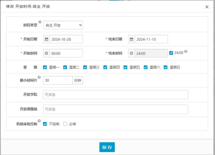 6.在开放时间设置中,可以设置开始日期和结束日期,以及每天可以开放的时间点。