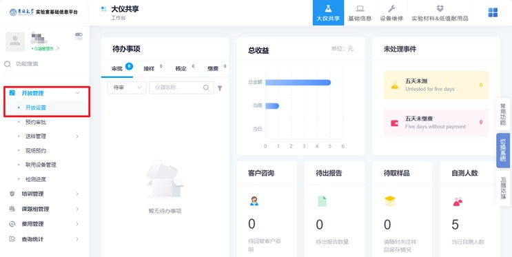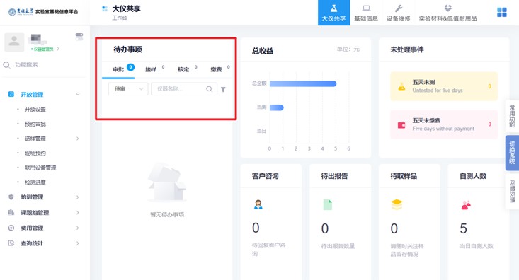 2.进入大仪共享界面后,在待办事项界面会提示需要审批、核定和缴费等信息。