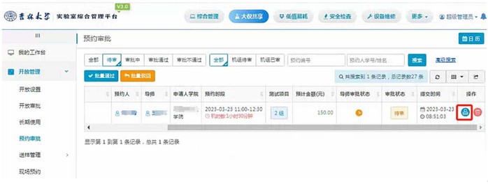 7.设备管理员需要对管理的设备进行预约审批。审核预约时间、样品数量等信息。